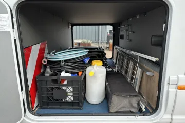 Deurmat, tafel, stoelen, gieter, emmer, markeringsbord fietsendrager, verloopstekker, veiligheidshesjes, verlengkabel 30m, gasflessen, waterslang, startkabels, oprijblokken, toiletvloeistof, reserveolie, droogrek met wasknijpers, brandblusser, lampensetje, zekeringensetje, gevarendriehoek, spanbanden luifel, klein gereedschap setje, sleep oog, hamer, AD blue trechter, kleine haringen, bezem met lange steel.