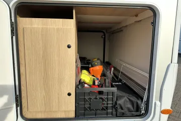 Deurmat, tafel, stoelen, gieter, emmer, markeringsbord fietsendrager, verloopstekker, veiligheidshesjes, verlengkabel 30m, gasflessen, waterslang, startkabels, oprijblokken, toiletvloeistof, reserveolie, droogrek met wasknijpers, brandblusser, lampensetje, zekeringensetje, gevarendriehoek, spanbanden luifel, klein gereedschap setje, sleep oog, hamer, AD blue trechter, kleine haringen, bezem met lange steel.